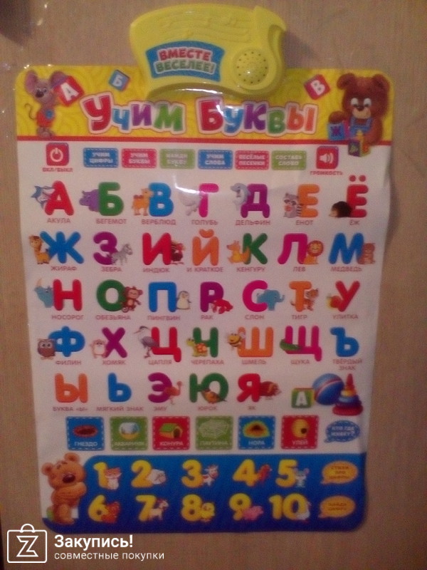 Очень расстроилась , заказала ребенку электронный обучающий плакат \"Учим буквы\". Заказ получила 04.11.2017, чтобы удобнее ребенку было, прикрепил муж плакат скотчем к двери шкафа (вставили 3 мизинчиковых батарейки). Раз пять ребенок нажал на песенки, после появился писк (звук одной тональности), который не даёт себя отключить (остальные кнопки не работают), убрала одну батарейку (думала \"отдохнёт\" заработает :)))). Сегодня решила проверить вновь (вставила батарейку), удалось послушать только одну песенку и опять писк. Печально, но в последнее время, мне не везёт с покупками на сайте ekb- zakupis.