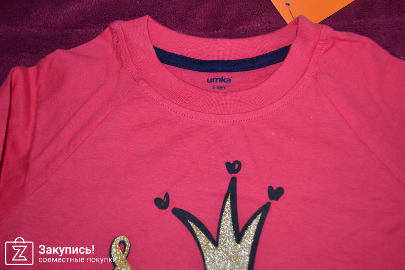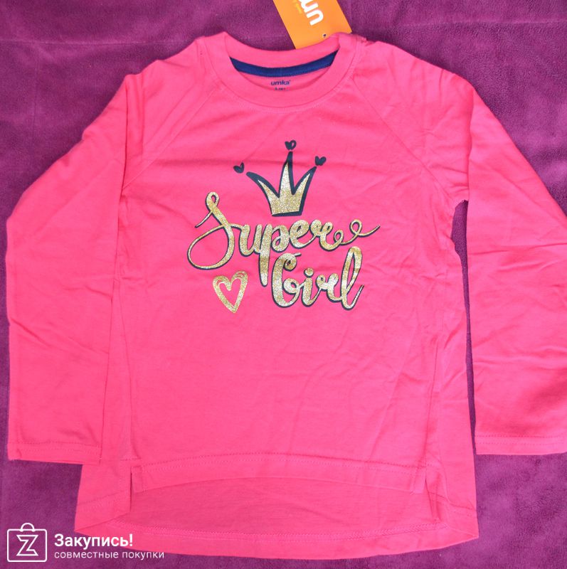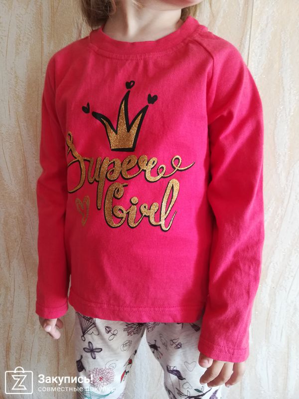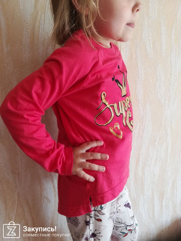 Милейшая кофточка, качество хлопка и принт отличное, тянется хорошо. Цвет малиновый, чуть полиняло, идёт в размер (на наш рост 102см заказала 104 размер). Все прошито аккуратно и хорошо. Ещё один плюс низкая цена. Дочка довольна. Рекомендую одежду этой марки.