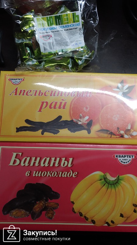 О том, что в моем родном городе фирма Квартет производит вкусные конфеты я знала давно, но каждый раз приезжая в Тюмень не могла выкроить время, чтоб заехать и купить. Спасибо, Алевтина, за закупку!!! Кусочек тепла с малой Родины 😊😊😊 Заказывала Бананы в шоколаде, Апельсиновый рай и Тюменское лакомство. Последние конфетки приятно удивили сочетанием миндаля и мармелада! В принципе все конфетки вкусные, но больше всего я не могла оторваться от бананов 😍😍😍🍌🍫 Свеженькие конфетки всегда приятно кушать. Заказ получила 9 сентября, Бананы произведены и упакованы 30 августа, Апельсиновый - 28 августа, а лакомство - 4 сентября! Всем рекомендую!!!