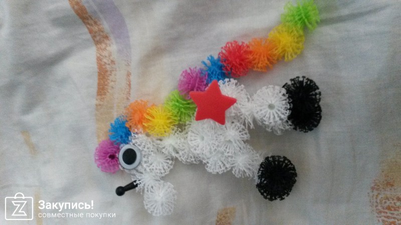 Заказывала банчемс. Детки мои были в восторге, до этого ни чем подобным заниматься не приходилось. Детальки-шарики похожи на репейник и хорошо склеиваются между собой, вот таким образом можно слепить что угодно+ещё пакетик с кучей всяких ног, глаз и всего прочего. Конечно 400 шариков для двоих маловато, лучше сразу два набора брать.
