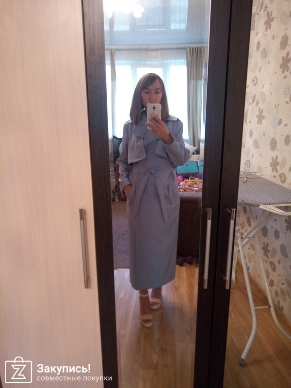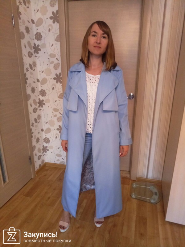 Ткань такая как у плащей,гладкая,плотная, оч хорошая. капельки дождя не впитываются,стекают. Мне с моим ростом,конечно и рукав длинный,я его внутрь загнула. На 40-42 плечи смотрятся как на модели с фото. Еще у него,конечно,как и у пальто оч красивый подклад.