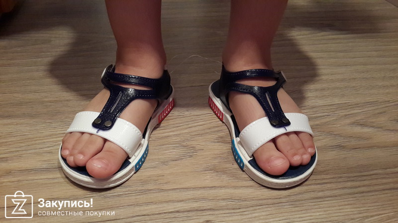 Босоножки бело-синие размер 29 по стельке 15,5см. Нога у ребенка 15,2. Немного нога уходит вперед, но вполне нормально. Брали для отпуска, поэтому устраивает размер вполне.