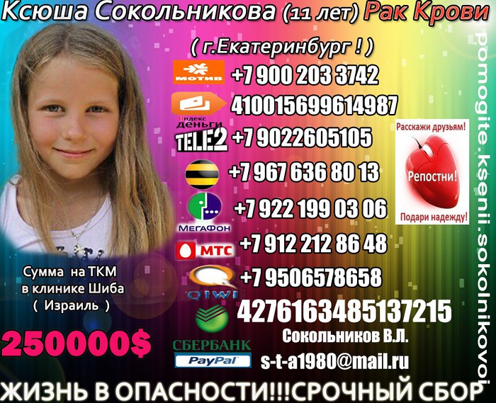 РЕПОСТ, пожалуйста. Ксюша Сокольникова, 12 лет (ЛЕЙКОЗ)