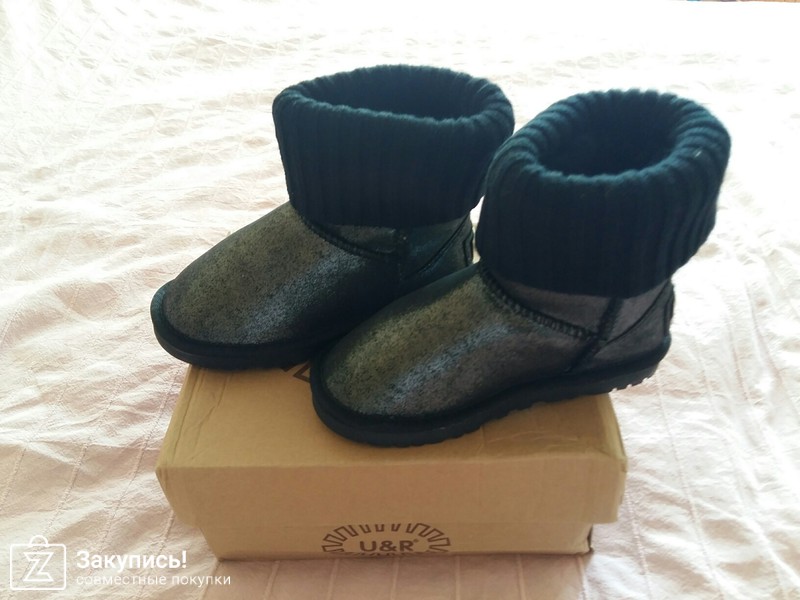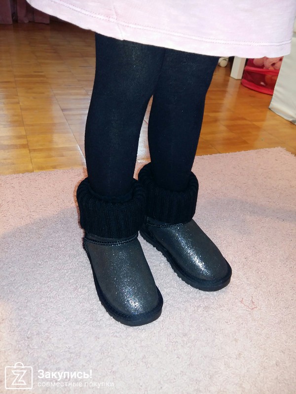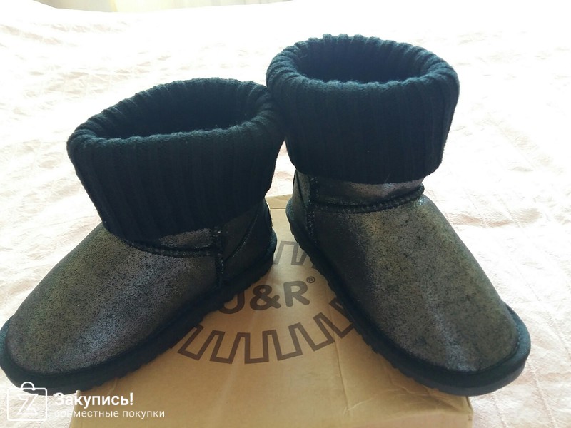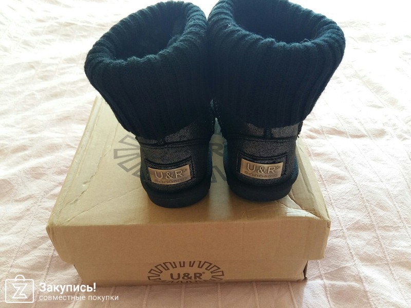 Угги для дочурки. Размер 31. Это не кожа, как мне кажется, что это блестящая плотная ткань, внутри мех натуральный. Сшиты качественно, строчки ровные. Сзади бирка только кривовато пришита. Думаю на год хватит вместо валенок. Цена 1870