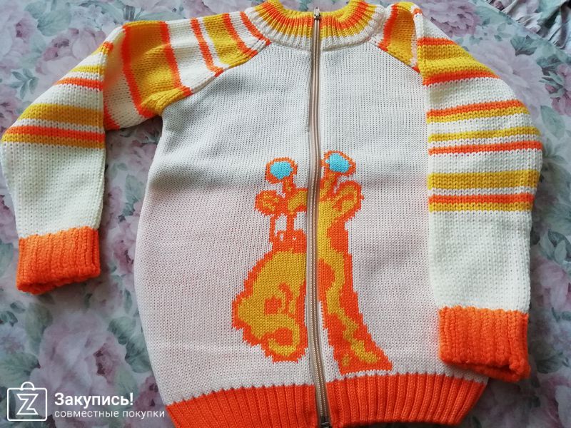 Купила сыну кофточку. 104 на рост 100 с запасом. Передние полочки трикотаж в 2 слоя. Спинка и рукава одинарная более крупная вязка. Выглядит мило и нежно (на фото цвет ярче чем в реале). Девочке тоже подойдёт. Понравилось, что в манжетах мягкие резиночки. Спасибо оргу. Хорошая закупка.