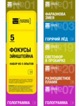 В комплект входят 5 экспериментов: Фараонова змея, Голограмма, Горячий лед, Разноцветное пламя, Светофор в пробирке.
