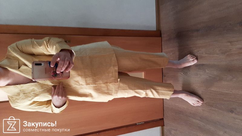Костюм очень понравился, хлопок (немного стрейч), на лето будет идеален. Цвет не такой, как на сайте, он более спокойный. Но, к сожалению, на мою фигуру не сел, в чати брюк... На полноразмерный 46 размер. Жакет на поясе. Ну и рост наверное должен быть выше все-таки)) у меня 160