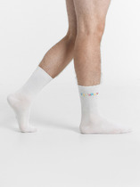 Рис.2489 Мужской носок с высоким плотным бортом и рисунком в виде надписи и гриба.— Описание у На сайте поставщика