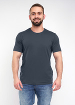 Фуфайка с коротким рукавом среднего объема, круглым вырезом горловины, которая оформлена обтачкой из рибаны.— Описание у На сайте поставщика