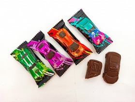 Конфеты в кондитерской глазури в форме машинки с вафельной крошкой, печеньем с какао, пэк мини, взрывной карамелью со вкусами клубника, кола