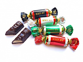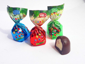 Конфеты куполообразной формы, с комбинированной начинкой, со вкусами черной смородины, клюквы, яблока, клубники, апельсина.