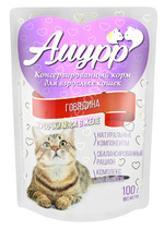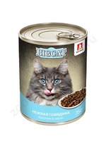 Влажный корм для кошек. Состав: Мясо и субпродукты (говядина не менее 35%), злаки, таурин, минеральные вещества, витамины.