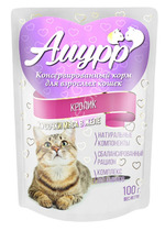 Влажный корм для кошек. Состав: Мясо и субпродукты (кролик не менее 35%), злаки, таурин, минеральные вещества, витамины.