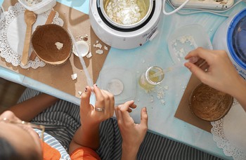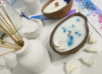17:30 изготовление ароматических свечей из натурального соевого воска ( в стакане, кокосе, ракушке, подсвечнике из гипса, баночке) и аромакубиков