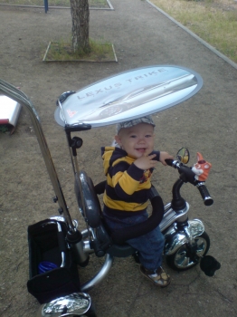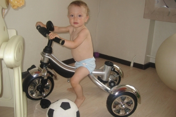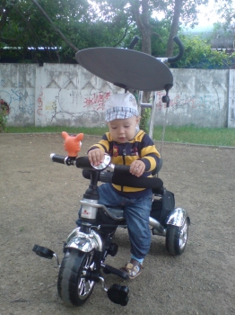 Вот наконец-то нашла время выложить фотку!!!! Велик просто замечательный,еще ни у кого тоакого не видели.На нем научились кататься на двухколесах,до этого катались на 4х колесном(нам сейчас 3,8г)А переключатель скоростей вообще писк моды-планетарный,такие сейчас ставят только на дорогоие взрослые велики.