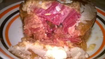 Отделить желтки от белков. Желтки смешать с размягченным сливочным маслом (3 ст. л.), добавить измельченную ветчину и зелень, специи. Перемешать. Отдельно со щепоткой соли взбить белки, перемешать с рисом, добавить специи. Смазать сковороду сливочным маслом, выложить рис, сверху положить смесь с ветчиной. Поставить в горячую духовку на 5-6 минут.