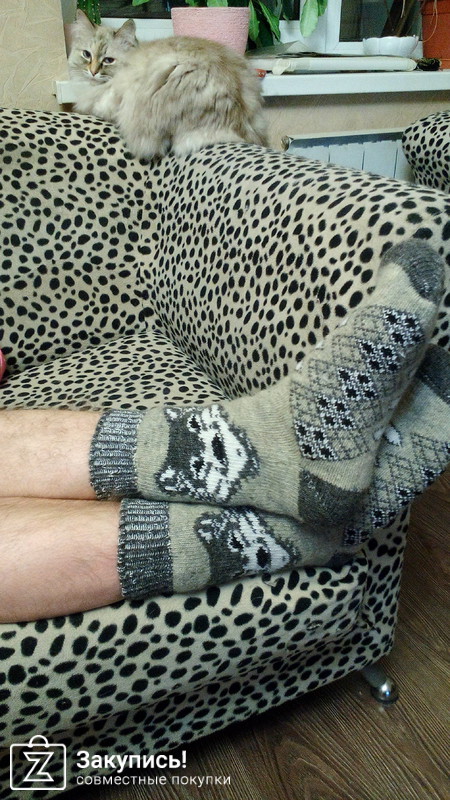 Получила мужские носки с мордой волка. Мужу понравились, надел и не снимает, наверное спать в них ляжет!))))) Спасибо за закупку!