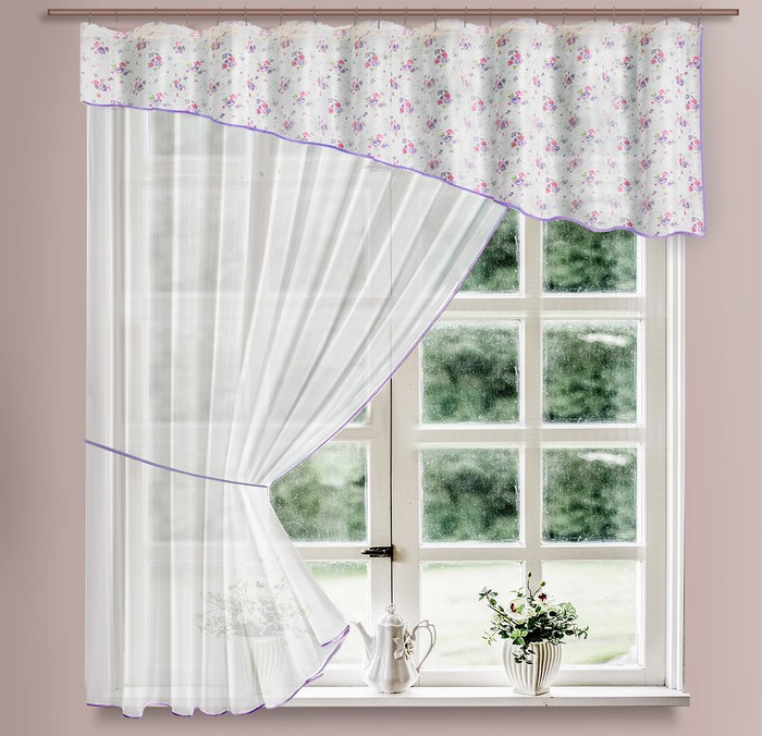 Занавеска из мягкой вуали средней прозрачности. состоит из 2-х частей, пришитых на одну шторную ленту. Украшена атласной бейкой. Максимальная высота ламбрекена - 75 см. Цвет ламбрекена - белый с фиолетовыми цветами, цвет длинной шторы - белый. 100% полиэстер. светонепроницаемость -10-12%. Производство FIRANKA.
