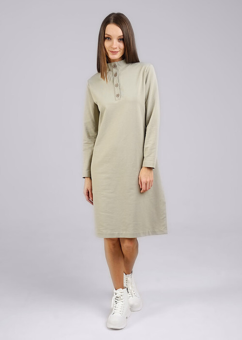 Платье из эластичного хлопкового футера 2х нитки. Длинный втачной рукав. Воротник стойка и планка с застежкой на пуговицы выполнены из кашкорсе. По низу изделия разрезы.