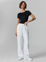 Брюки прямые с посадкой на талии свободного силуэта. Спереди карманы с отрезным бочком, с подкладкой из кулирного полотна. Пояс отрезной с эластичной тесьмой внутри 60RV. На внешней стороне петли, через которые выводится шнур с металлическими эглетами (8EKXWCp-1). Нижние срезы брюк обработаны швом вподгибку.