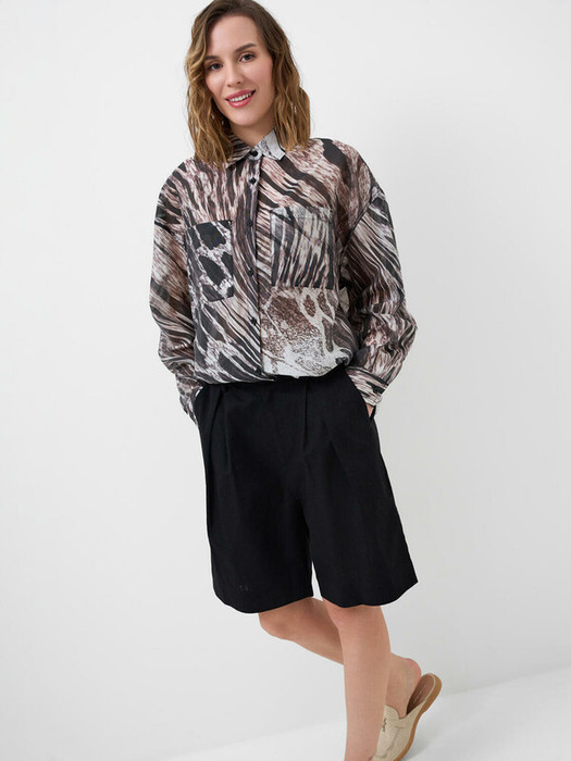 Классические женские льняные шорты. Модель средней длины, чуть выше колена. Комфортная посадка и прямой силуэт, который немного расширяется к низу. Шорты застёгиваются на молнию и пуговицу, и имеют боковые карманы. Пояс дополнен шлёвками для ремня.