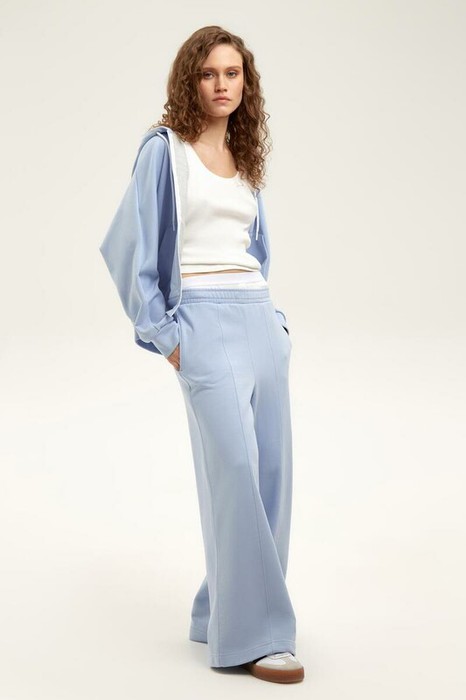 Брюки свободного силуэта со стрелками из мягкого двухцветного футера. Внутренняя сторона изделия представлена в натуральном цвете хлопка, внешняя в нежно-голубом. За счет использования крашенной пряжи, данный вид полотна прошел минимальную обработку, что придало изделию мягкость и шелковистость.