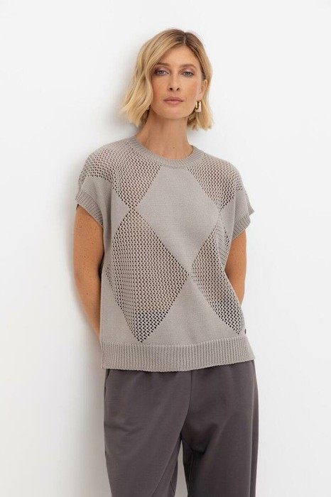 Джемпер со спущенным плечом ажурной вязки из итальянского хлопка. Умеренное переплетение, хлопок в составе придают изделию форму и ощущение комфорта во время носки. Незаменим в повседневном летнем гардеробе.