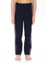 Трикотажные брюки для мальчика из высококачественного трикотажного полотна супрем. Эластичный пояс на резинке регулируется по ширине с помощью шнурка, по бокам два удобных кармана, внизу эластичные манжеты.