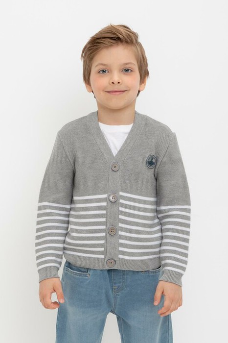 Вязаный кардиган в полоску для мальчика с втачными рукавами. Связан из хлопковой пряжи. На рукавах эластичные манжеты. Внизу мягкий пояс. Застёгивается на пуговицы.