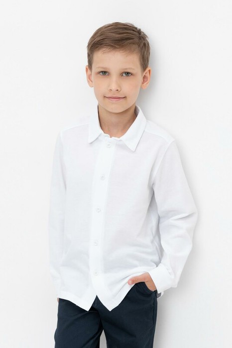 Рубашка школьная для мальчика из высококачественного трикотажного полотна пике. У изделия вязаный воротник, манжеты и застежка спереди на пуговицы.