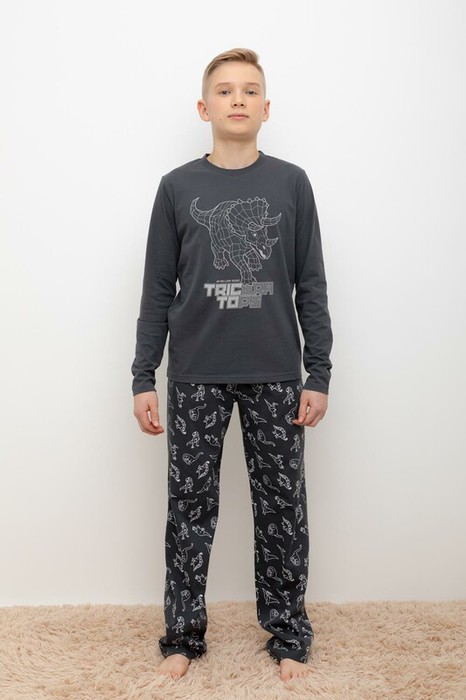 Трикотажный пижамный комплект из натурального хлопка. У джемпера длинные втачные рукава. Брюки с удобным поясом на резинке и утягивающим плетеным шнуром. Оригинальная набивка выполнена из стойких, гипоаллергенных текстильных красителей. Все трикотажные полотна производятся в соответствии с нормами Швейцарского сертификата ЭкоТекс.