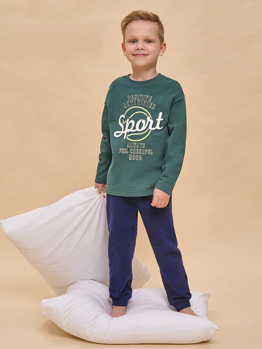 Пижама детская для мальчика утепленная. Натуральный состав ткани из 100% хлопка (футер с начёсом) обеспечивает изделию мягкость, гипоаллергенность и воздухопроницаемость. Благодаря этому сон комфортный и качественный. В пижаме из хлопка ребёнку будет тепло, даже если он сбросит одеяло. Джемпер и брюки умеренного объёма, рукава широкие и свободные — комплект для сна очень удобен. В поясе и по низу брюк мягкая и широкая резинка — не перекручивается и не давит. Отделка горловины джемпера из эластичной рибаны — ребёнку удобно надевать и снимать пижаму. А также рибана сохраняет отличную форму надолго. Хлопковая пижама украшена стильным принтом в актуальной университетской эстетике, надписи переводятся: «позитивная деятельность», «спорт!», «всегда чувствуй себя хорошо». Детская пижама для мальчика неприхотлива в уходе. Принт эластичный и мягкий, без проблем переносит частые стирки. Детская пижама с брюками подходит для сна как дома, так и в детском саду — отличный выбор для вашего ребёнка! Помните о правильном уходе за изделием: рекомендуется стирать при температуре не выше 30 °C, без предварительного замачивания, с изнанки. Это поможет сохранить качество и цвет пижамы на длительное время.