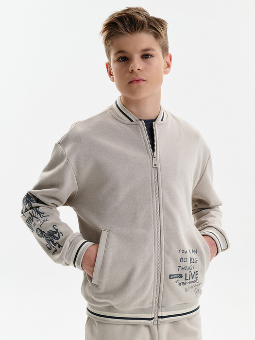 Бомбер для мальчика – трикотажная модель свободного кроя.  Изделие выполнено из смесовой ткани с высоким содержанием хлопка и небольшим добавлением полиэстера.Бомбер на центральной застежке молнии, со спущенным плечом и углубленной проймой. Воротник, манжеты по рукавам и низу изделия - из декоративного полосатого риба. Боковые карманы с листочками расположены на переде под наклоном. Бомбер декорирован принтом и надписями. Перевод текста на рукавах: никогда не сдавайся; наслаждайся. Перевод на кармане: Ты можешь совершать великие дела. Живи настоящим. Всё, что у нас есть, — это настоящее.