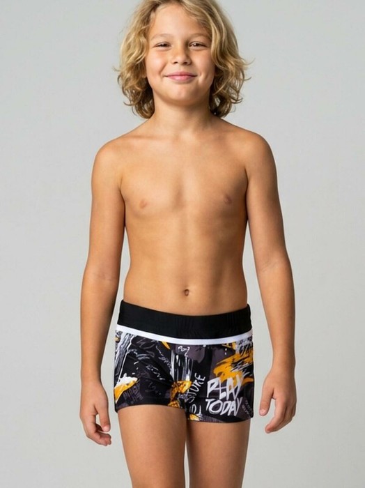 Плавки-шорты средней длины, прилегающего силуэта для мальчика подростка. Изготовлены из эластичного трикотажа, с подкладкой для большего комфорта. Ткань устойчива к солнцу и солёной воде, благодаря UF-защите сохраняет насыщенность цвета и структуру волокон. В поясе — удобная резинка и регулируемый шнурок. Спереди — яркий принт.