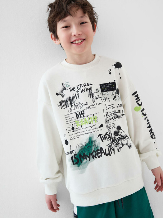 Свитшот оверсайз для мальчика подростка. Выполнен из мягкого, хлопкового футера без начеса. Модель свободного кроя с длинными рукавами и круглой горловиной. Манжеты, ворот и низ изделия обработаны эластичным рибом. Главный акцент — оригинальный принт спереди в стиле граффити с надписями, рисунками и яркими акцентами. На правом рукаве расположен дополнительный принт.