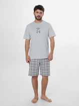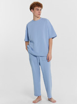 Костюм мужской, состоящий из футболки и брюк. Футболка однотонная с принтом на груди; модель свободная, со спущенной линией плеч, овальным вырезом горловины. Брюки из полотна с набивным рисунком эксклюзивного дизайна, прямые, с боковыми карманами с обтачными входами, на притачном поясе с отстроченной эластичной тесьмой.