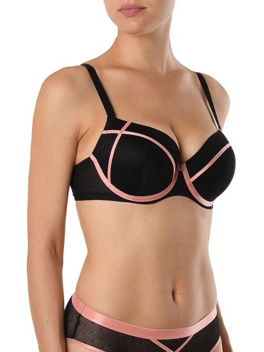 Бюстгальтер серии Galaxy – это легкое жаккардовое полотно в мелкую сеточку с рисунком, напоминающим россыпь звезд в небе, лаконичные тесьмы с атласным блеском и безупречная посадка по фигуре. Преимущества модели:- формованная чашка, на каркасах;- боковые детали стана на подкладке;- элегантная металлическая подвеска в виде буквы «С».