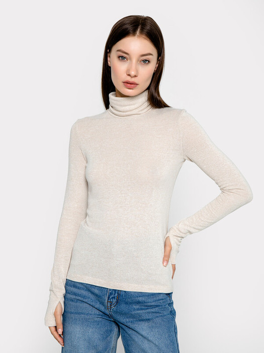 Женский джемпер облегающего силуэта, созданный из легкой и нежной вискозы с небольшим добавлением полиэстера.  Вырез круглой формы, с отложенным воротником-стойкой. Рукава длинные, прилегающие. Изюминка джемпера – удлиненные манжеты с прорезью для пальца. Идеально для прохладной погоды!