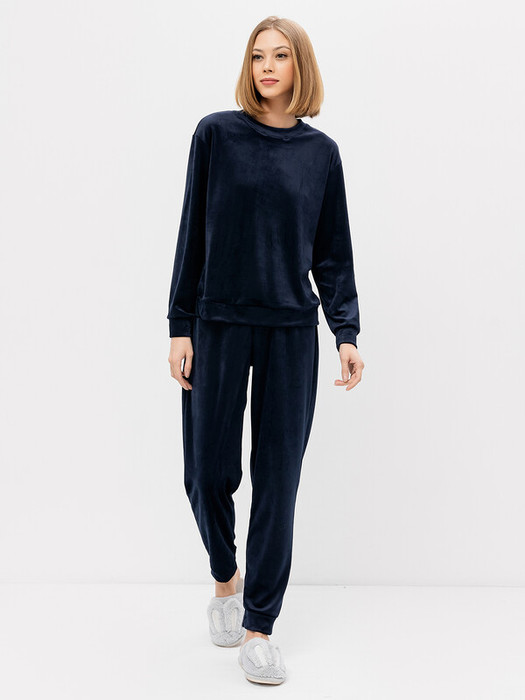 Велюровый женский домашний комплект, включающий лонгслив и брюки. Лонгслив прямого силуэта, с круглым вырезом и длинными свободными рукавами на манжетах. Брюки длинные, классические, свободного силуэта, завершаются манжетами. В поясе брюк – мягкая эластичная тесьма. Рекомендуем для домашнего отдыха!