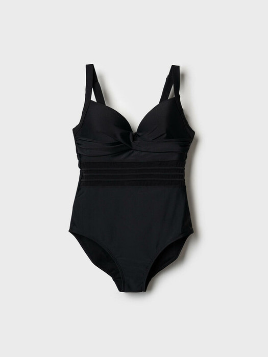 Женский черный слитный купальник. В области груди — мягкие чашки с косточками и декоративной драпировкой, обеспечивающие хорошую посадку. На талии — полупрозрачные вставки из сетки с полосами, визуально подчеркивающие фигуру. Спинка с аккуратной застежкой на металлическую пряжку и регулируемыми бретелями. Внутри - подкладка. Благодаря UF-защите, ткань сохраняет первоначальный вид даже при длительном пребывании на солнце. Подойдет для пляжа, отдыха и активного лета.
