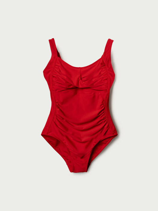 Женский слитный купальник. Перед оформлен мягкой драпировкой и перекрещивающимися складками, создающими визуальный эффект запаха. По бокам — сборки, которые визуально стройнят фигуру. Изделие выполнено из эластичной ткани, внутри есть подкладка. Бретели широкие, регулируются по длине с помощью металлической фурнитуры. На спинке — небольшой металлический значок. Внутри — чашечки для поддержки груди. Благодаря UF-защите, ткань сохраняет первоначальный вид даже при длительном пребывании на солнце. Подойдет для пляжа, отдыха и активного лета.