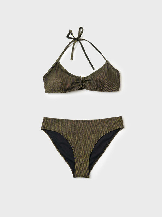 Раздельный женский купальник. Лиф с мягкими чашечками и завязками на шее, спереди украшен металлическим полукольцом, сзади — декоративным бантом. По бокам встроены мягкие косточки для поддержки. Плавки классической формы, украшены металлической фурнитурой на спинке. Внутри — мягкая подкладка для комфорта. Благодаря UF-защите, ткань сохраняет первоначальный вид даже при длительном пребывании на солнце. Подойдет для пляжа, отдыха и активного лета.