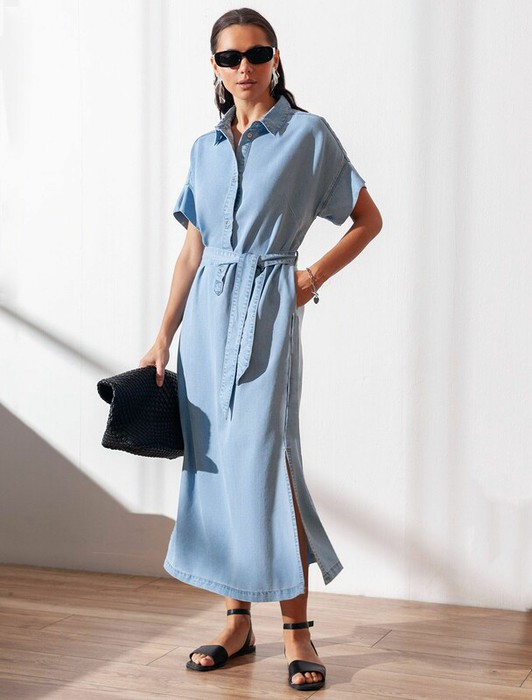 Джинсовое длинное платье-рубашка плотностью 7,8 OZ светло-голубого цвета с поясом и разрезами — универсальное решение для современного гардероба. Модель легко вписывается как в повседневный, так и в деловой стиль. Пояс отлично подчеркивает талию, а цельнокроеный рукав добавляет комфорта. Высокие разрезы по бокам обеспечивают свободу движений, добавляют динамики образу и стиля. Особенность этого платья - состав ткани, сочетающая прочность и мягкость лиоцелла с вискозой, что делает её невероятно комфортной, дышащей,, устойчивой к сминанию и идеально подходящей для чувствительной кожи. Благодаря нежным тактильтным ощущениям, будто шелк, от которого ощущается приятная прохлада, легкое платье подойдет на теплое время года и даже на жаркое лето. Повседневное платье с коротким рукавом подходит на большие размеры и способно подчеркнуть красоту любой фигуры. Продуманный свободный крой платья с отложным воротничком отлично садится на разные типы телосложения, создавая аккуратный и современный образ. Классический силу