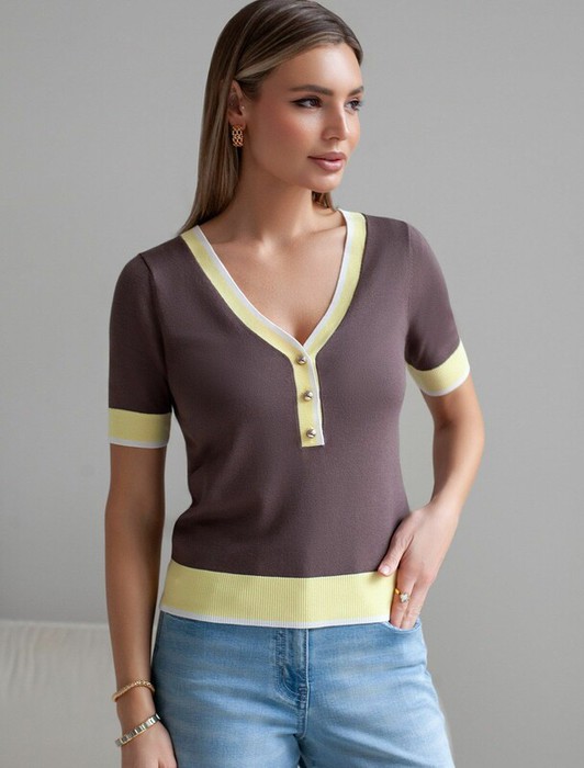 Совместные покупки Симферополь Женская одежда Джемперы, свитеры, водолазки — 09.04 Vilatte Джемпер с V-вырезом с коротким рукавом из вискозы D39.387 кофейны