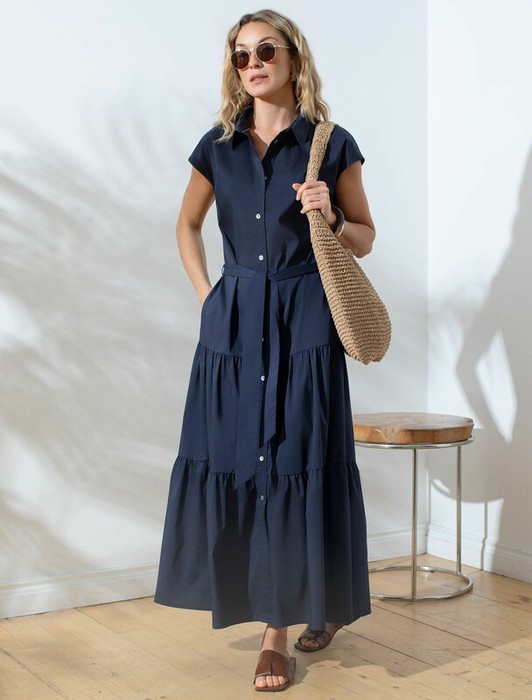 Платье А-силуэта с поясом фисташкового цвета выполнено из легкого хлопкового поплина плотностью 123 Г/м2. Воздушное платье на пуговицах по всей длине с пышной юбкой-воланами в стиле бохо отличный вариант для теплой и жаркой погоды. Модель обладает красивым ярусным кроем, который придает образу женственность и элегантность. Отложной воротничок и короткий рукав создают стильный акцент, подходящий для повседневного ношения и различных ситуаций. Талия подчеркнута поясом, который легко регулируется и подчеркивает силуэт, придавая особый шарм и аккуратность образу.  Натуральный состав ткани обладает высокой воздухопроницаемостью, а также способностью поглощать и отдавать влагу. В повседневном платье будет очень комфортно, благодаря правильной регуляции температуры тела. Такая модель подходит на маленький  и высокий рост, а так же на любую фигуру, позволяя подчеркнуть достоинства и скрыть возможные недостатки. Это длинное платье отлично подойдет тем, кто ценит удобство и утонченность в одежде из качественной вискозы