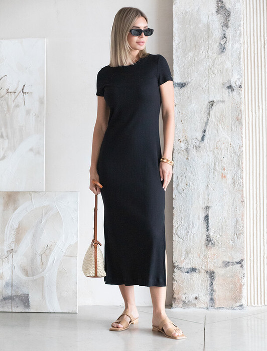 Платье выполнено из трикотажа в широкий рубчик. Модель дополнена высокими разрезами по бокам. Премиальное качество хлопковых волокон и наличие эластана в составе изделия способствуют идеальной посадке по фигуре не сковывая движений. Изделие сохранит свой безупречный внешний вид в течении долгого времени.