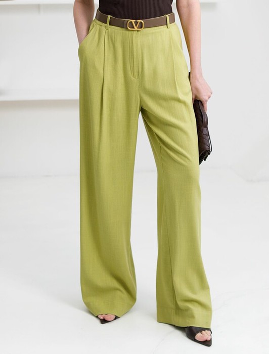 Свободные брюки палаццо салатового цвета изо льна с вискозой, плотностью 200 Г/м2 — выбор, который легко выделит в любой обстановке. Свободные длинные брюки с высокой посадкой создают идеальный силуэт, визуально вытягивают и стройнят фигуру. Натуральный состав ткани обладает высокой воздухопроницаемостью, хорошо драпируется и мягко прилегает к фигуре, создавая струящиеся складки. Мягкая эластичная резинка, встроенная в пояс брюк, обеспечивает идеальную посадку по фигуре, не сдавливая талию и гарантируя максимальный комфорт при движении. В повседневных брюках будет очень комфортно, благодаря правильной регуляции температуры тела. Брюки подходят на маленький  и высокий рост, а так же на любую фигуру, позволяя подчеркнуть достоинства и скрыть возможные недостатки. Летние льняные брюки отлично сочетаются с монохромным верхом для вытягивания силуэта, с ними можно создавать эффектные наряды как на выход, так и для ежедневных рабочих дел или простых прогулок, от делового шика до повседневного кэжуал.