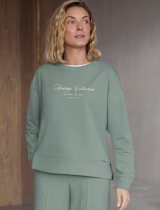 Стильный свитшот светло-оливкового цвета из премиального футера двухнитки с эластаном сочетает в себе комфорт и оригинальность. Джемпер выполнен из натурального хлопка, который обеспечивает мягкость и дышащие свойства ткани. Нежный материал дарит ощущение уюта в любое время года, а премиальное качество изготовления гарантирует долговечность и сохранение формы после множества стирок. Особенность изделия — спущенная линия плеча и аккуратные разрезы, которые добавляют современный акцент и делают образ более выразительным. Эффект имитации футболки в виде белой отделки на вороте делает дизайн динамичным и повышает градус стиля. Принт в виде надписи придает индивидуальность, позволяя выделиться без лишней вычурности. Перевод надписи Vintage collection Cotton club Inspired by 1978 - Винтажная коллекция Cotton Club, вдохновленная 1978 годом. Дополнен металлическим логотипом бренда. Представлена широкая размерная линейка, включая маленькие и большие размеры, что позволяет подобрать идеальный вариант для разной фигуры