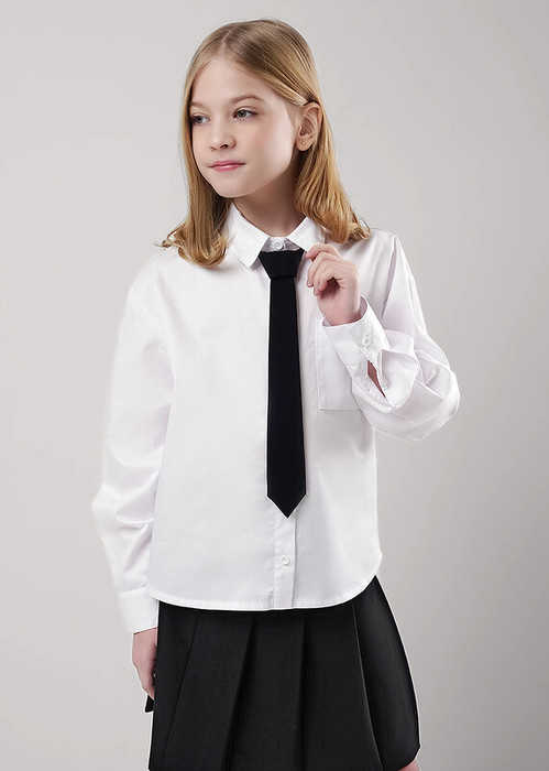 Стильная кроп рубашка из поплина станет отличным дополнением к вашему гардеробу. Воротник со стойкой, планка и манжеты на пуговицах. Модель дополнена контрастным галстуком на резинке. Рубашка идеально подойдёт для школьных и повседневных образов.