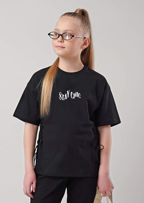 Стильная футболка из трикотажного полотна с эластаном прекрасно дополнит твой гардероб. Модель дополнена эластичной горловиной, шнуровкой по бокам и лаконичным принтом.Создавай стильные образы, сочетая модель с шортами или брюками из новой коллекции!